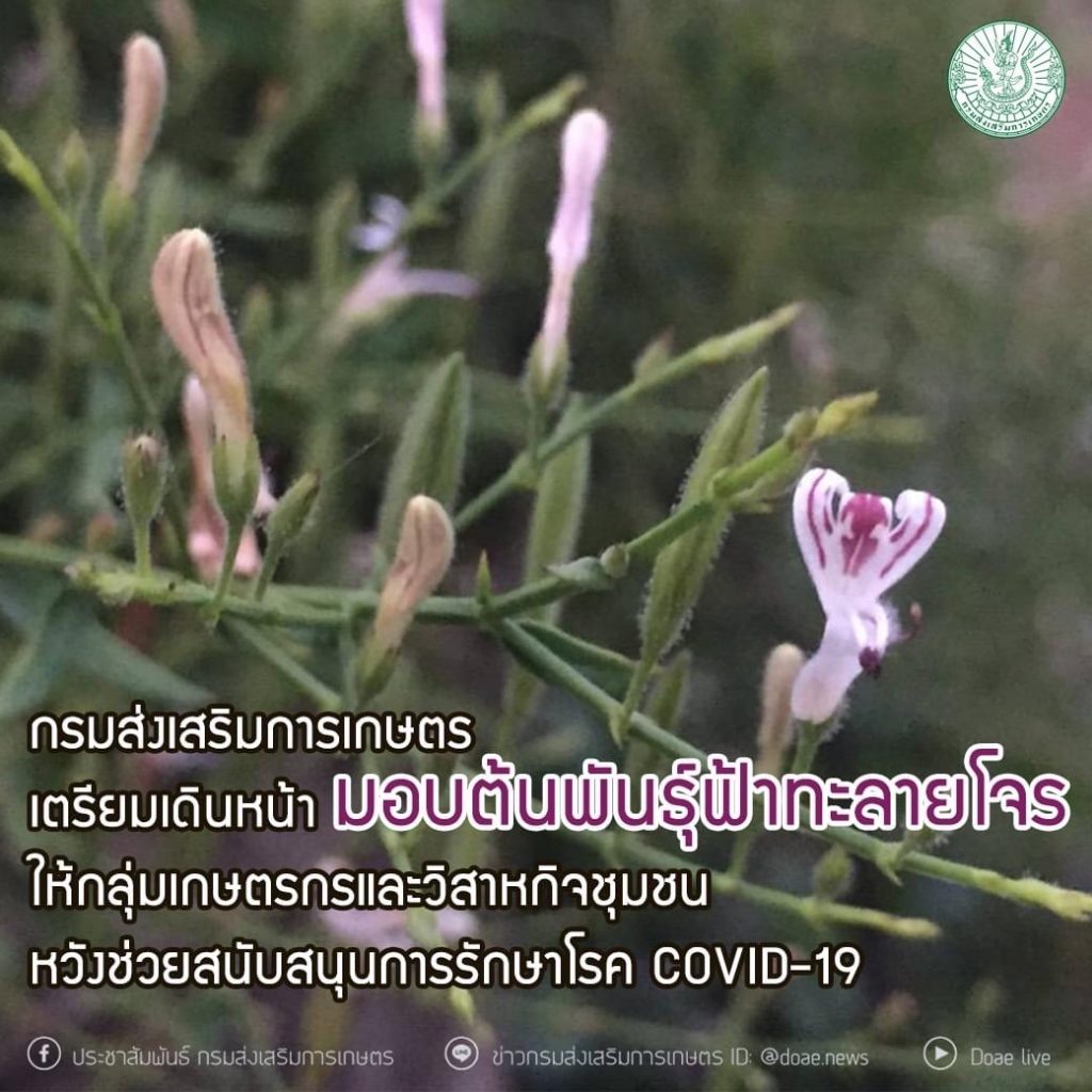 มอบต้นพันธุ์ฟ้าทะลายโจร 15/07/2564 admin_jay Uncategorized, ข่าวประชาสัมพันธ์ 0 กรมส่งเสริมการเกษตร เตรียมมอบต้นพันธุ์ฟ้าทะลายโจรให้แก่กลุ่มเกษตรกรแลพวิสาหกิจชุมชน เพื่อสนับสนุนการรักษาโรค COVID-19ขอบคุณข้อมูล :FB : ประชาสัมพันธ์ กรมส่งเสริมการเกษตร