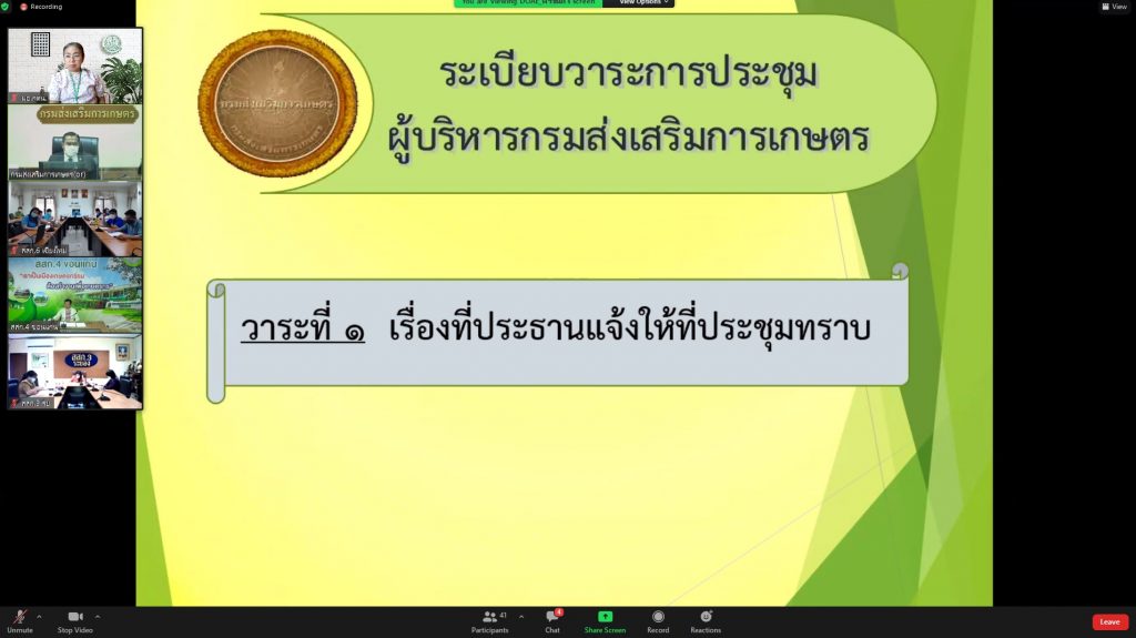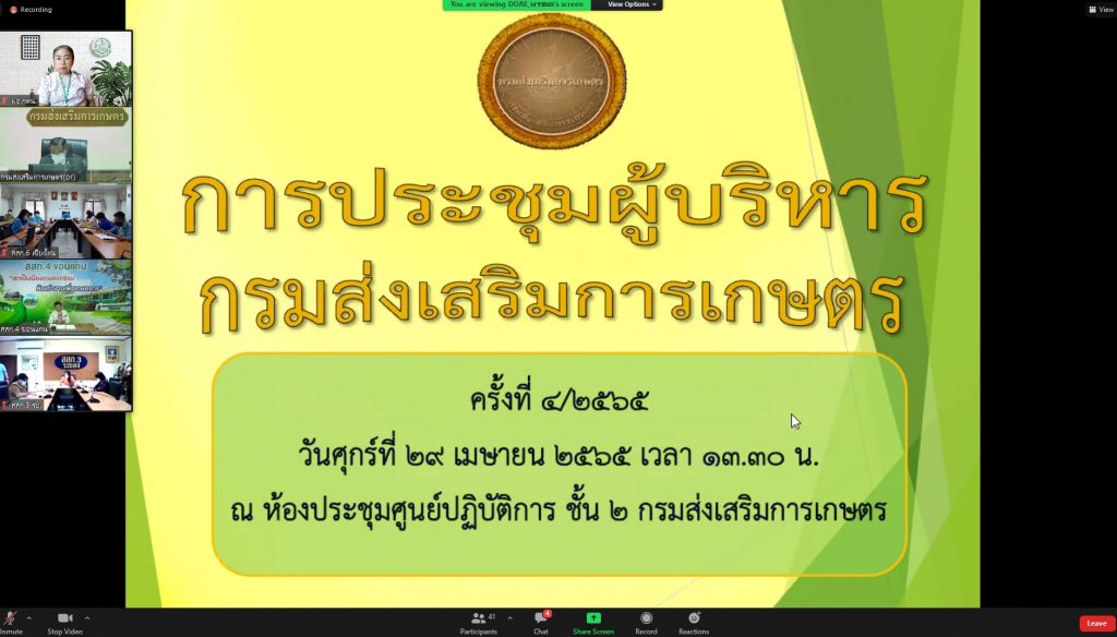 การประชุมผู้บริหาร กรมส่งเสริมการเกษตร ครั้งที่ 4/2565 เพื่อติดตามความก้าวหน้าการดำเนินงาน ในปีงบประมาณ พ.ศ. 2565 ผ่าน Video Conference โดยนางศศิญา เพชรกำเนิด นักวิชาการตรวจสอบภายในชำนาญการพิเศษ ปฏิบัติหน้าที่ผู้อำนวยการกลุ่มตรวจสอบภาย และนางสาวบังเอิญ แก้วพระโต นักวิชาการตรวจสอบภายในชำนาญการพิเศษ และนางปนัชดา มาแนม นักวิชาการตรวจสอบภายในชำนาญการ เข้าร่วมการประชุมในวันที่ 29 เมษายน 2565