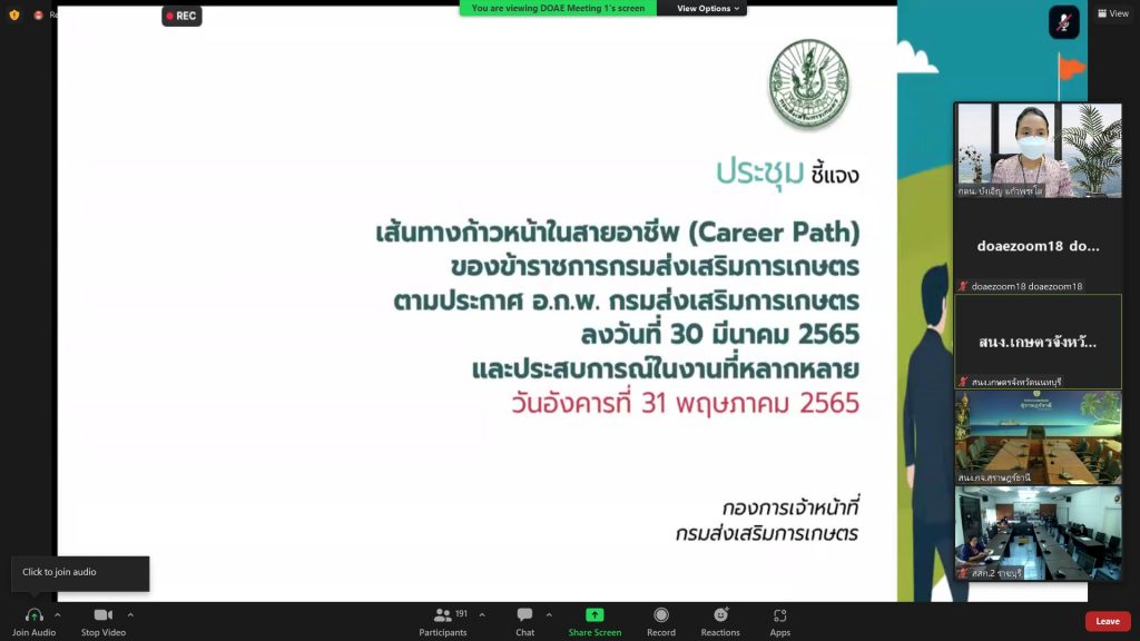 การประชุมชี้แจงหลักเกณฑ์การพิจารณาคุณสมบัติข้าราชการที่เปลี่ยนแปลงไปจากเดิม เพื่อให้ข้าราชการกรมส่งเสริมการเกษตรศึกษาและทำความเข้าใจ เพื่อเตรียมความพร้อม กำลังคน คุณภาพ และการสั่งสมประสบการณ์และผลงานในการเข้าสู่ตำแหน่งเป้าหมาย (Critical Position) และตำแหน่งในเส้นทางก้าวหน้า (Ladder Position) โดยนางสาวบังเอิญ แก้วพระโต นักวิชาการตรวจสอบภายในชำนาญการพิเศษ เข้าร่วมการประชุม ผ่านระบบ Zoom ในวันที่ 31 พฤษภาคม 2565