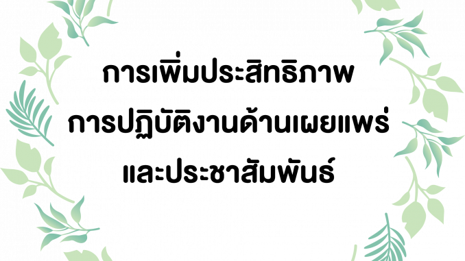 การอบรม หลักสูตร การเพิ่มประสิทธิภาพการปฏิบัติงานด้านเผยแพร่และประชาสัมพันธ์ เพื่อให้ผู้เข้ารับการอบรมมีความเข้าใจเกี่ยวกับแนวทางการเผยแพร่และประชาสัมพันธ์ กำหนดประเด็นเนื้อหาในการผลิตสื่อ และเผยแพร่ได้อย่างถูกต้องและน่าสนใจ โดยนางสาวสุภาพร ยืนยงค์ เข้าร่วมการอบรม ระหว่างวันที่ 18 – 20 มกราคม 2566