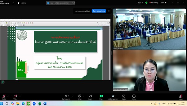 โดยนางปนัชดา มาแนม นักวิชาการตรวจสอบภายในชำนาญการพิเศษ ร่วมเป็นวิทยากรบรรยาย เรื่อง “การบริหารความเสี่ยงในการปฏิบัติงานส่งเสริมการเกษตรในระดับพื้นที่” ในวันที่ 15 มกราคม 2568 ผ่านระบบ Zoom